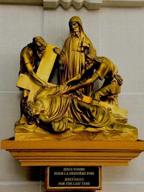 The second fall of Jesus under the weight of the cross signifies His extreme physical and spiritual suffering․ Despite His earlier fall‚ Jesus continues His journey‚ driven by His commitment to redeem humanity․ This station highlights His vulnerability and the immense burden He carries‚ both literally and figuratively․ The crowd’s mixed reactions—some in disbelief‚ others in compassion—underscore the complexity of human response to suffering․ This moment invites us to reflect on our own struggles and how we‚ like Jesus‚ can persevere through adversity․ Let us ask for the grace to endure our trials with faith and courage‚ remembering that even in weakness‚ there is strength when we trust in God․ May this station inspire us to carry our own crosses with resilience and hope‚ following Christ’s example of unwavering dedication to His mission․ Through His fall‚ we are reminded of the transformative power of sacrifice and the promise of redemption․ Let us pray for the strength to remain faithful‚ even in our darkest moments‚ and to find hope in the knowledge that our struggles are not in vain․ Jesus’s second fall teaches us that perseverance in the face of hardship is a testament to His boundless love for us․ By embracing our own crosses‚ we unite ourselves with Christ’s journey‚ deepening our understanding of His sacrifice and its profound significance for our salvation․ As we reflect on this station‚ may we find the courage to face our challenges with the same determination and love that Jesus demonstrated․ His second fall is a powerful reminder of His humanity and His divine mission‚ encouraging us to remain steadfast in our faith and to trust in God’s plan․ Let us draw strength from this moment‚ knowing that even in our weaknesses‚ we are never alone․ Jesus’s second fall invites us to surrender our burdens to Him‚ trusting in His grace to guide us through life’s difficulties․ In this way‚ we can walk more closely in His footsteps‚ carrying our crosses with renewed purpose and devotion․ Through prayer and reflection‚ may we deepen our connection to Christ’s Passion and find solace in His enduring love․ This station calls us to embrace our own struggles with courage‚ remembering that Jesus understands our pain and offers us the strength to persevere․ Let us turn to Him in times of trial‚ seeking His grace to carry our crosses with faith and hope․ The second fall of Jesus is a poignant reminder of His sacrifice and a call to live our lives in imitation of His love and resilience․ By uniting our sufferings with His‚ we participate in the redemption He offers‚ finding meaning and purpose in our own journeys․ May this station inspire us to face life’s challenges with the same courage and love that Jesus showed‚ trusting in His promise of eternal life․ Through His second fall‚ we are reminded that even in our darkest moments‚ there is always hope in Christ․ Let us strive to carry our crosses with the same determination and devotion‚ knowing that our struggles are not in vain․ Jesus’s journey teaches us that true strength lies in surrendering to God’s will and trusting in His plan․ As we reflect on this station‚ may we find the courage to persevere‚ drawing strength from Christ’s example and His boundless love for us․ The second fall of Jesus is a powerful symbol of His sacrifice and a call to live our lives in faith and hope․ May we continue our Lenten journey with renewed resolve‚ united with Christ in His Passion and trusting in His promise of redemption․ By reflecting on this station‚ we are reminded that our struggles are not isolated but are part of a larger story of salvation․ Let us carry our crosses with courage‚ knowing that we are accompanied by Christ‚ who understands our pain and offers us His strength․ The second fall of Jesus invites us to deepen our faith and to trust in His grace‚ even when the road ahead seems difficult․ May we find inspiration in His perseverance and strive to live our lives in imitation of His love and sacrifice․ Through this station‚ we are called to embrace our own struggles with courage‚ remembering that Jesus is always with us‚ guiding us through life’s challenges․ Let us pray for the grace to carry our crosses with faith and hope‚ trusting in Christ’s promise of eternal life․ The second fall of Jesus is a testament to His love and a reminder of the transformative power of His sacrifice․ May we draw strength from this moment‚ knowing that our struggles are not in vain‚ and that through Christ‚ we can overcome any trial․ As we reflect on this station‚ let us ask for the grace to remain faithful‚ even in our darkest moments‚ and to find hope in the knowledge that our struggles are part of a larger story of redemption․ Jesus’s second fall teaches us that perseverance in the face of hardship is a testament to His boundless love for us․ By embracing our own crosses‚ we unite ourselves with Christ’s journey‚ deepening our understanding of His sacrifice and its profound significance for our salvation․ As we continue our Lenten journey‚ may we find the strength to carry our crosses with courage and hope‚ trusting in God’s plan and the promise of eternal life through Christ․ The second fall of Jesus is a poignant reminder of His humanity and His divine mission‚ encouraging us to remain steadfast in our faith and to trust in God’s plan․ Let us draw strength from this moment‚ knowing that even in our weaknesses‚ we are never alone․ Jesus’s second fall invites us to surrender our burdens to Him‚ trusting in His grace to guide us through life’s difficulties․ In this way‚ we can walk more closely in His footsteps‚ carrying our crosses with renewed purpose and devotion․ Through prayer and reflection‚ may we deepen our connection